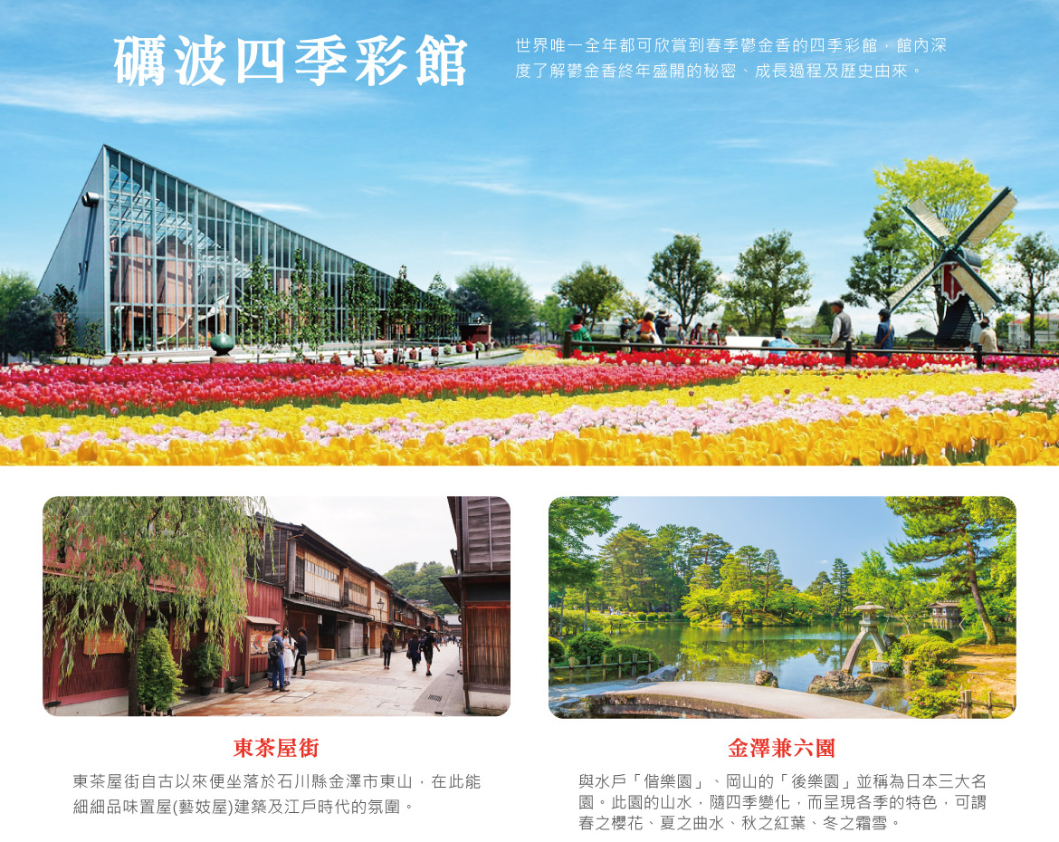 【金澤兼六園】與水戶「偕樂園」、岡山的「後樂園」並稱為日本三大名園,兼六園建於1676年,直到1871年才完工對外開放。此園的山水,隨四季變化,而呈現各季的特色,可謂春之櫻花、夏之曲水、秋之紅葉、冬之霜雪。原來只是金澤城藩主的庭園,經歷代藩主的整修擴建,而成為一座美麗的迴遊林泉式庭園,兼具宏大、幽遼、人力、蒼古、水泉、眺望等六大勝景。