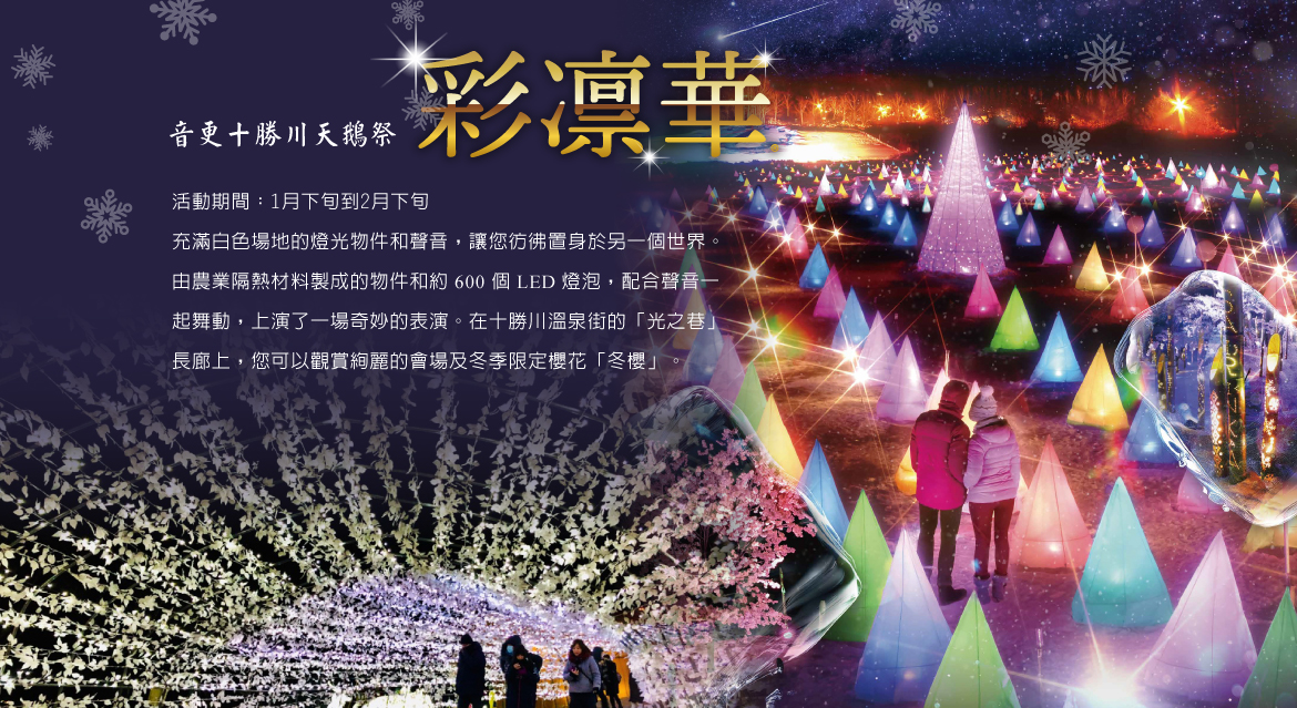【十勝白鳥飛來地】位於北海道帶廣市與音更町一帶的十勝川河畔,每年冬季自西伯利亞南下的大天鵝會聚集於此越冬,由於十勝川有溫泉湧出,部分河段不結冰,為白鳥提供理想的棲息環境。通常白鳥飛來期自12月上旬至翌年3月中旬,數量可達數百隻,形成雪白群舞的壯觀景象,是北海道著名的觀鳥景點。